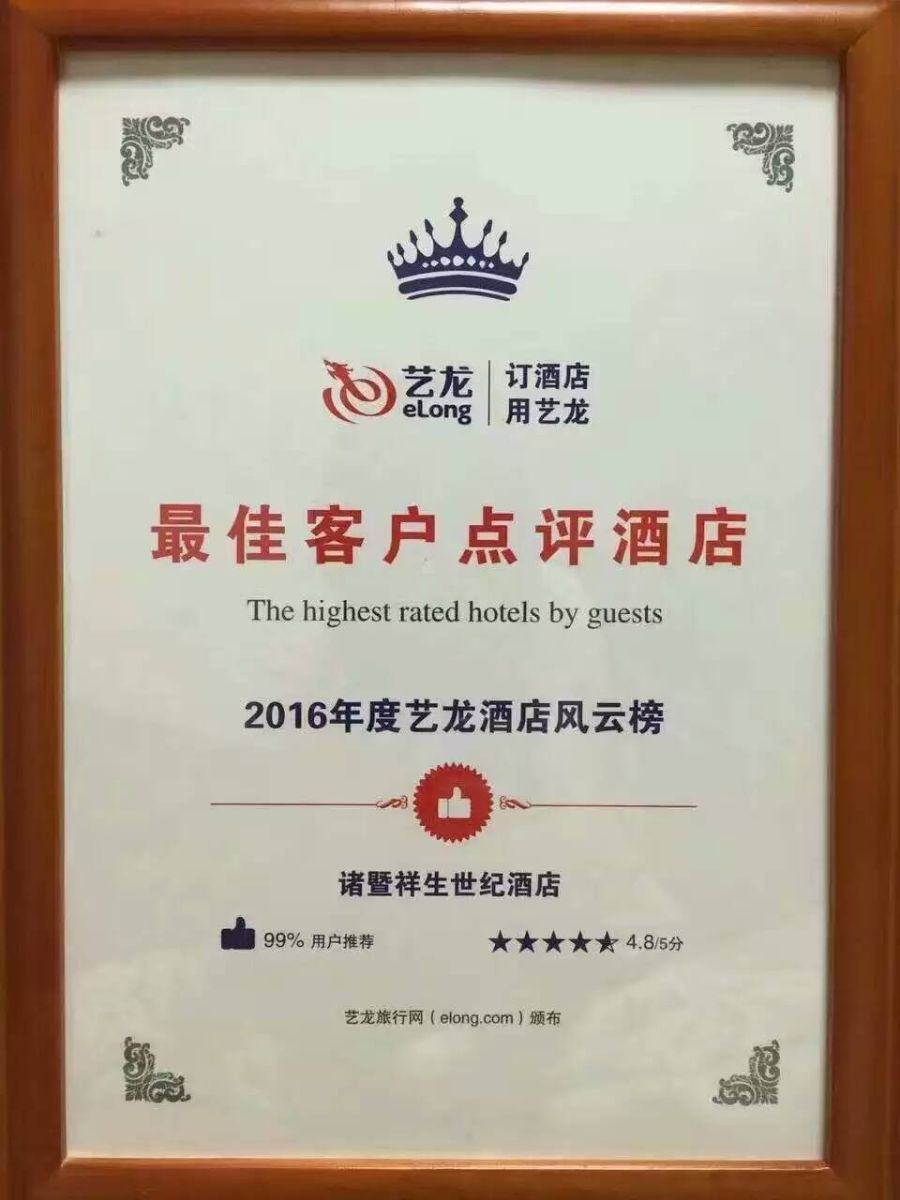 目前為止祥生世紀酒店在此網站共有1669條住客點評,好評率為99%,位居諸暨同地區第一。且服務指數達4.8/分(總分5分),順利獲得該獎項。