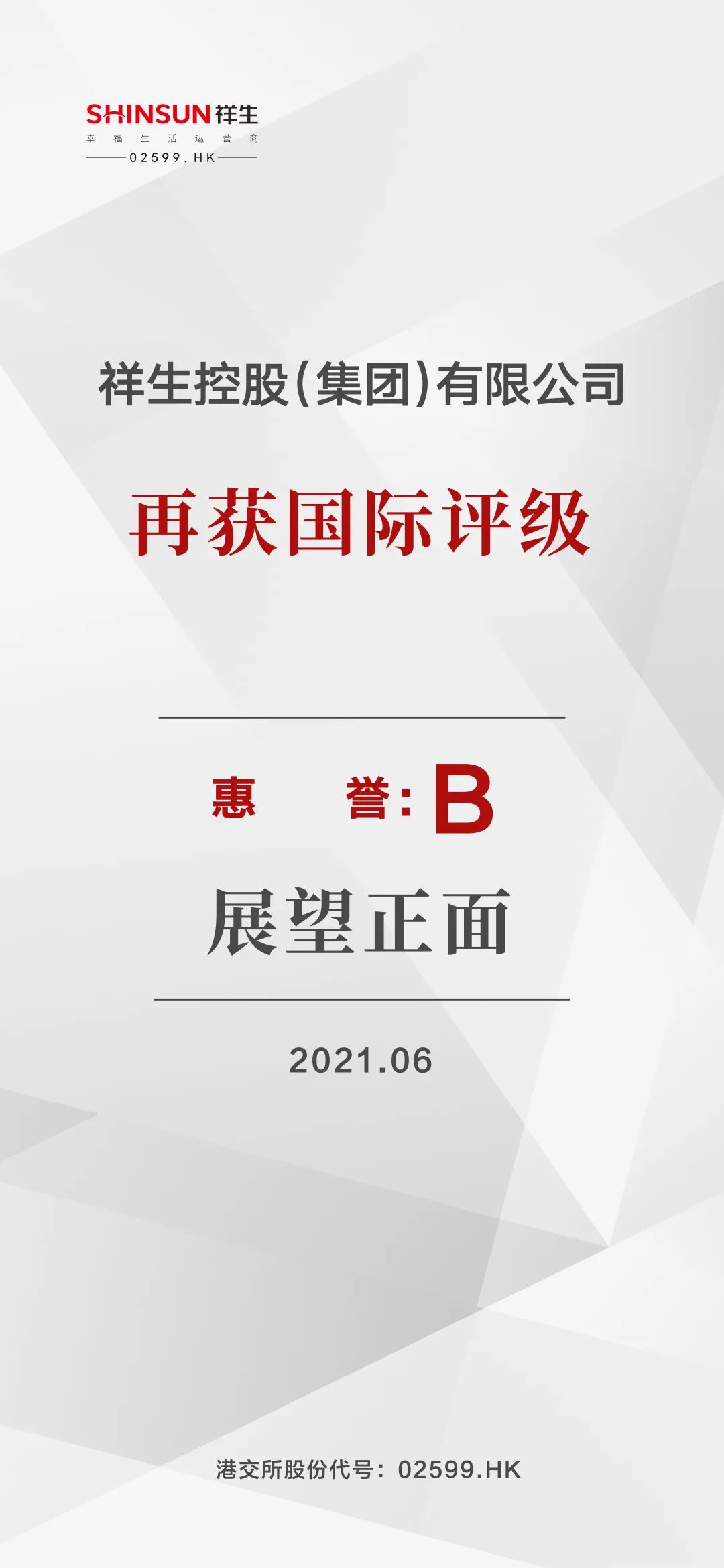 2021年6月3日,國際評級機(jī)構(gòu)惠譽(yù)確認(rèn)祥生控股(集團(tuán))有限公司(Shinsun Holdings (Group) Co. Ltd.,簡稱“祥生控股集團(tuán)”,02599.HK)長期發(fā)行人違約評級(IDR)為“B”,展望“正面”。此前,穆迪、標(biāo)普、聯(lián)合國際三家國際評級機(jī)構(gòu)已相繼發(fā)布對祥生控股集團(tuán)的長期主體信用評級結(jié)果——穆迪授予B2評級、標(biāo)普授予B評級、聯(lián)合國際授予BB-評級,評級展望“穩(wěn)定”。
