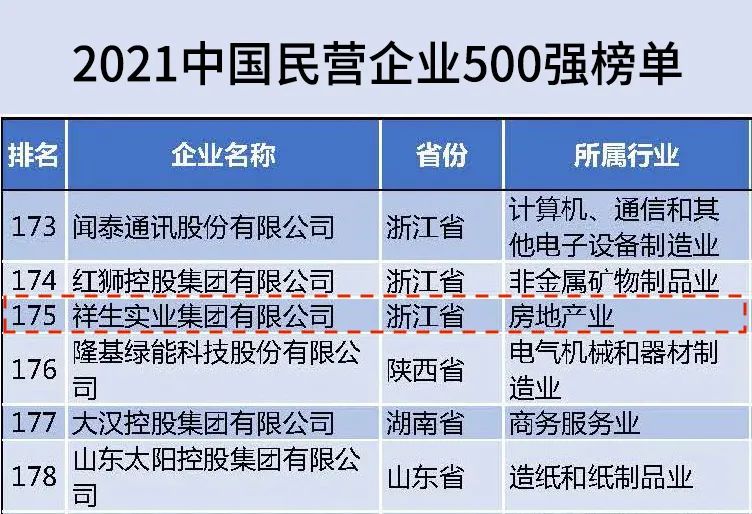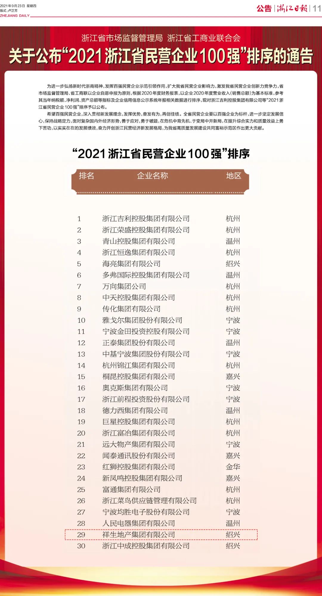 與此同時,浙江省市場監(jiān)督管理局和浙江省工商業(yè)聯(lián)合會于日前聯(lián)合公布了「2021年浙江省民營企業(yè)百強」榜單,祥生集團進入2021年浙江省民營企業(yè)100強行列,位列TOP29。