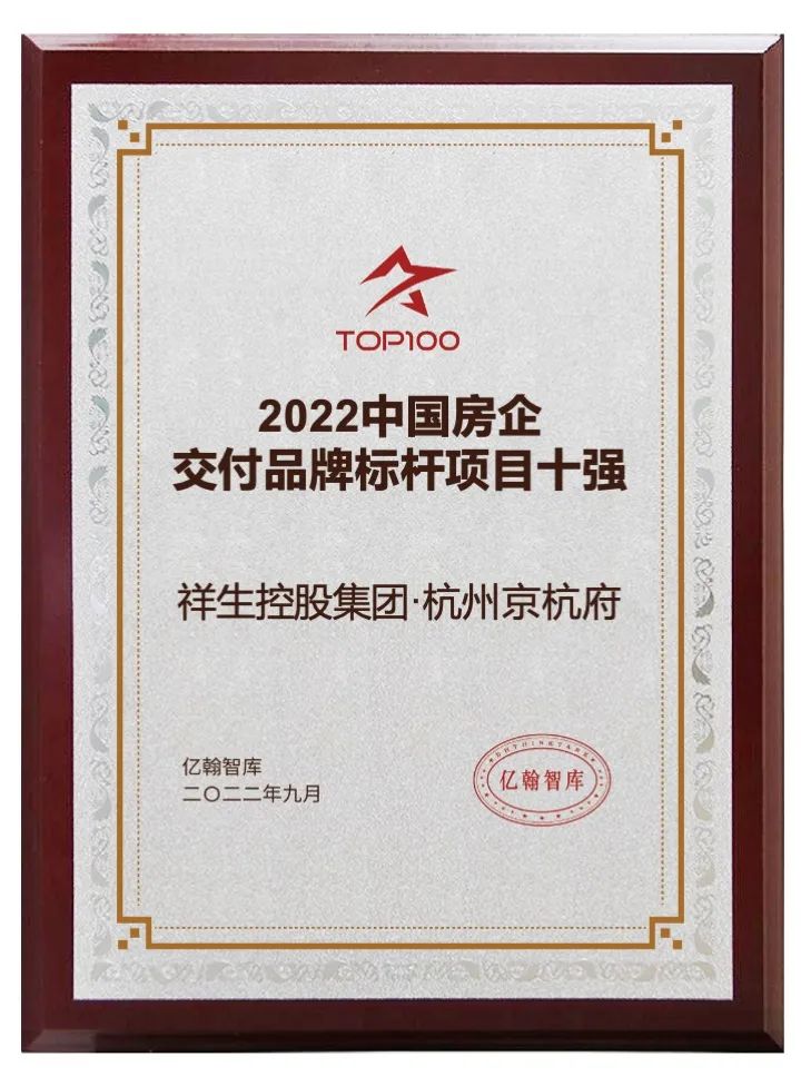 基于自身的長期穩健發展及品牌深耕,祥生控股集團在本次峰會獲得2022中國房企品牌價值TOP30、2022中國房企交付品牌標桿項目十強·杭州京杭府兩大獎項。